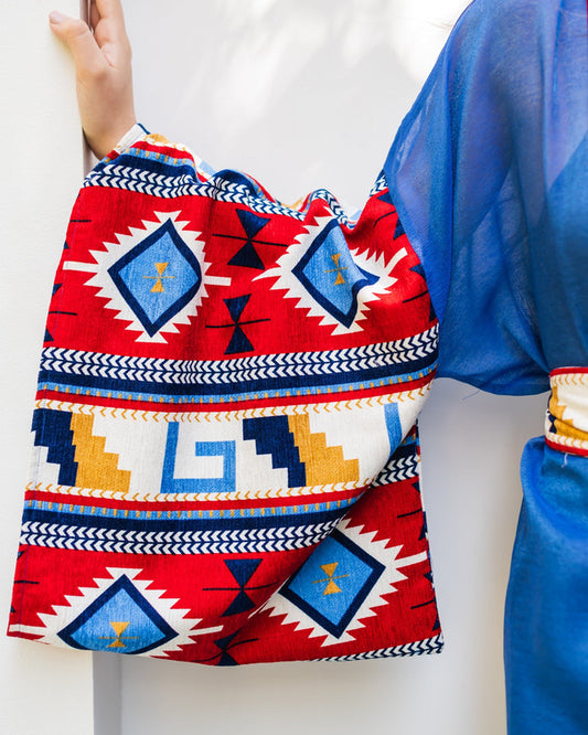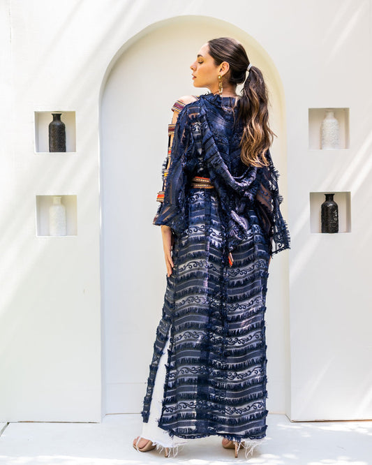 Moroccan Cuts Kaftan in Blue - Fuzzy Tulle Semi-Sheer Fabric with Indian Embroidery, Abaya Style, Made in Egypt - One Size Fit