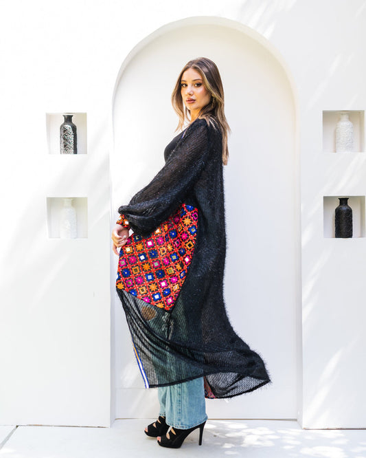 Glowing Handmade Black Kaftan Abaya - Semi-Sheer Fuzzy Tulle with Indian Embroidery by - Made in Egypt - One Size Fit