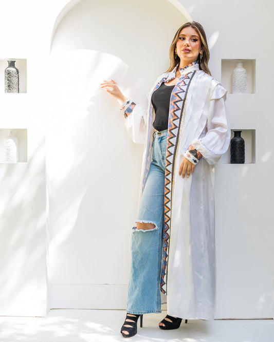 Women's Up-Pleated Satin Kaftan Abaya with Embroidery - White, Elegant Egyptian Design - One Size Fit