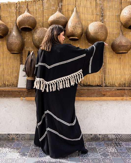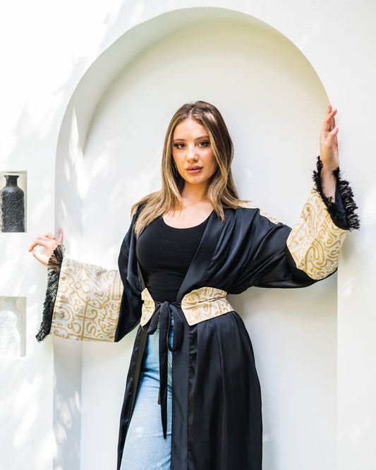Sonia Satin Kaftan Abaya in Black - Pure Satin with Fringes & Handmade Embroidery - Elegant Women's Fashion from Egypt - One Size Fit