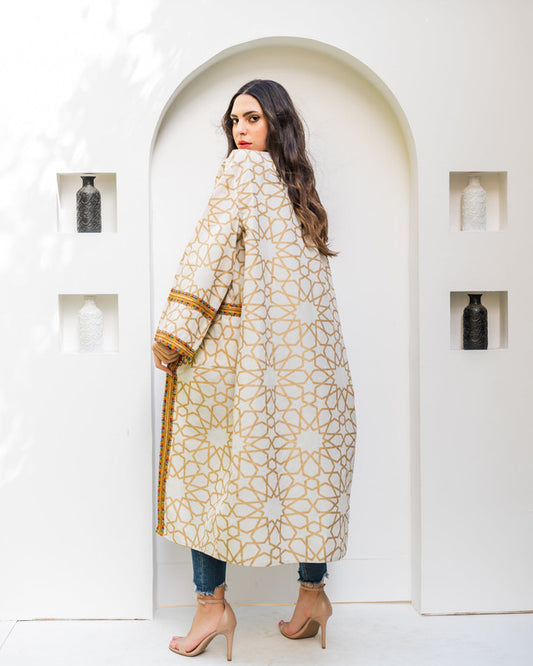Women's Beige Linen Arabesque Kaftan with Handmade Embroidery - Elegant Egyptian Cardigan Top - One Size Fit