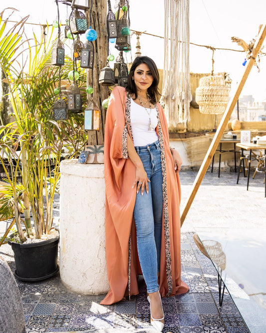 Women's Miral Abbaya - Orange Shimmer Satin Abaya Cardigan Dress, Made in Egypt - One Size Fit