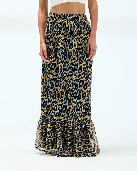 Women's Black & Yellow Tiger Print Skirt - Lined Chiffon Maxi Skirt, Free Size - Stylish Tiger Print for Casual and Festive Occasions