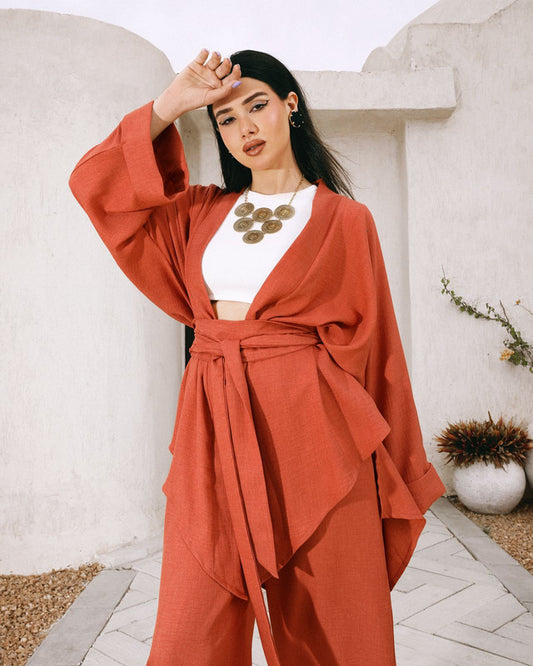 Women's Linen V-Cut Cardigan Set - Dark Orange, Stylish & Comfortable, Made in Egypt