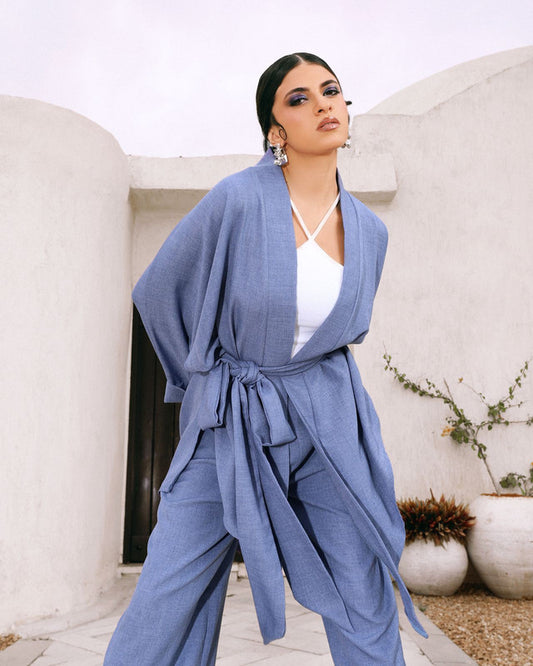 Women's Linen V-Cut Cardigan Set - Blue | Stylish & Comfortable | Made in Egypt