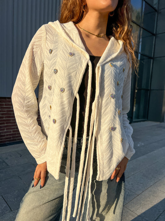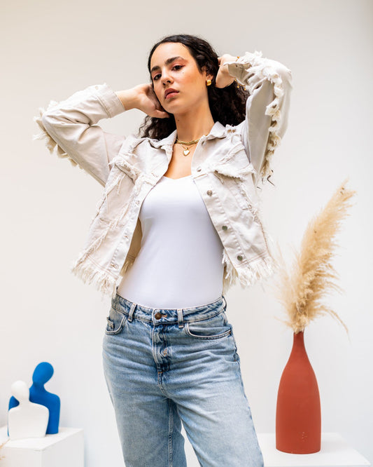 Women's Beige Fringed Denim Jacket - Stylish Casual Outerwear - Made in Egypt